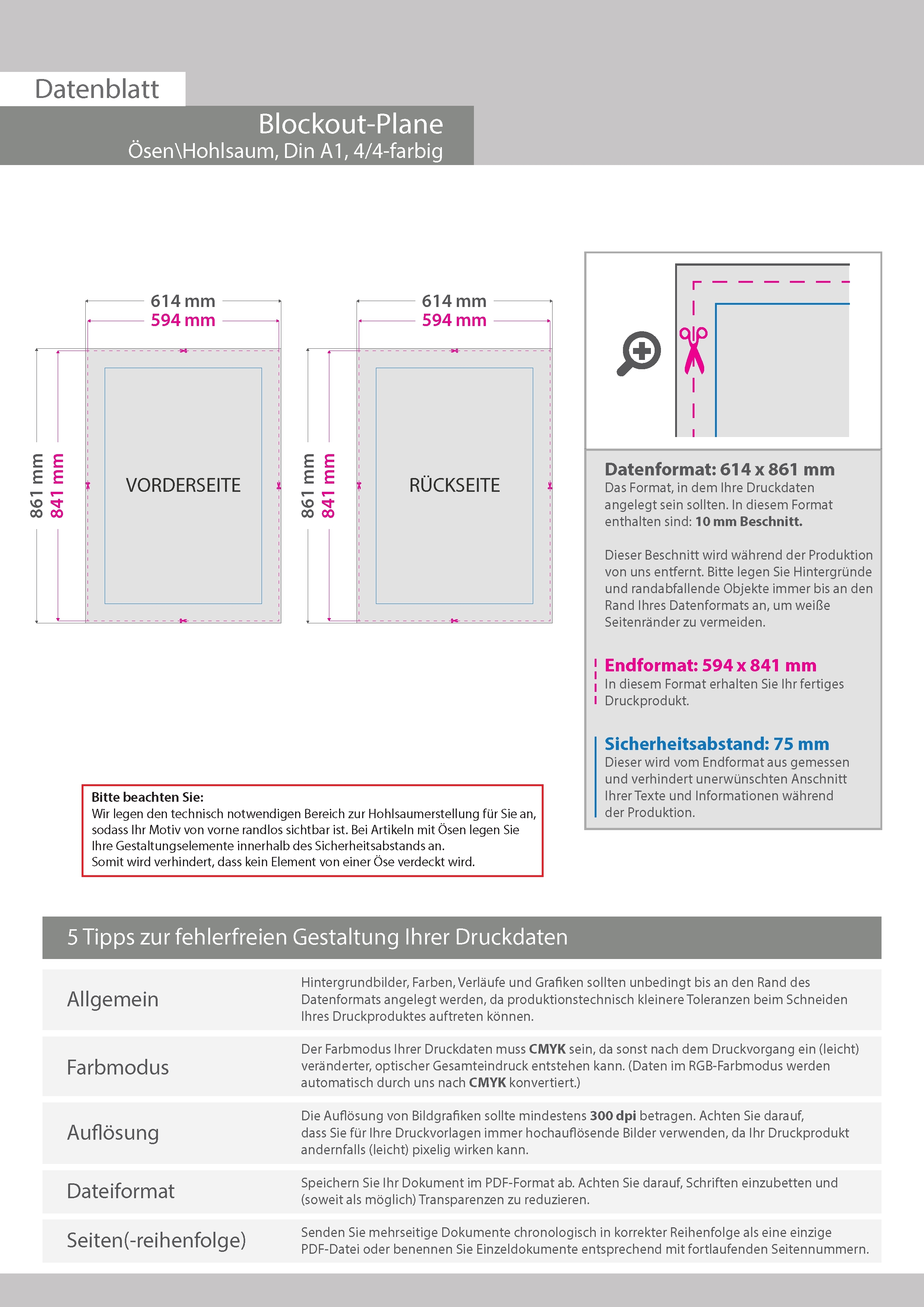 Hochwertige Blockout-Plane DIN A1 (59,4 x 84,1 cm), 4/4-farbig bedruckt, Ösen im Abstand von 50 cm oben und unten