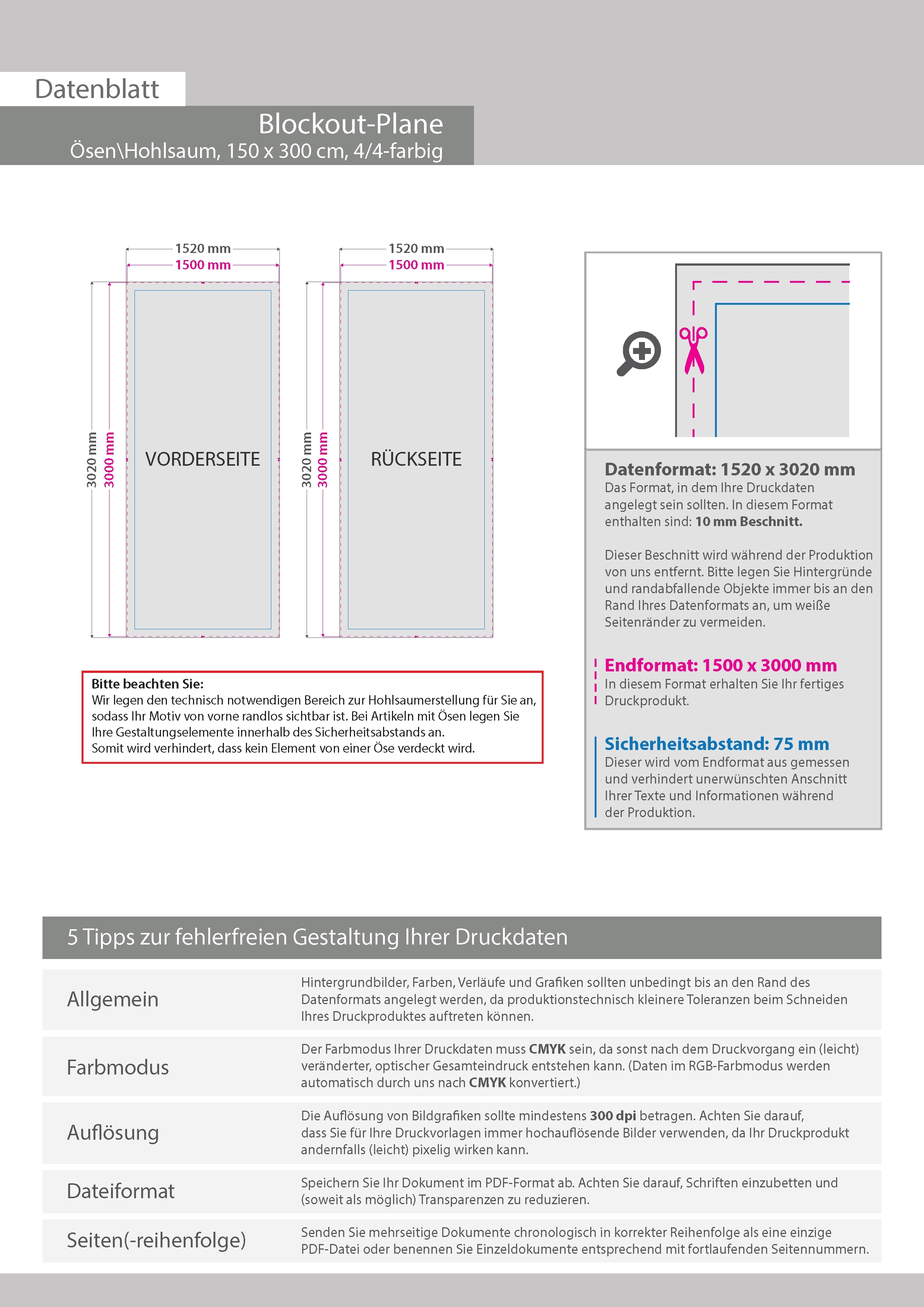 Hochwertige Blockout-Plane 150 x 300 cm, 4/4-farbig bedruckt, Ösen im Abstand von 50 cm oben und unten