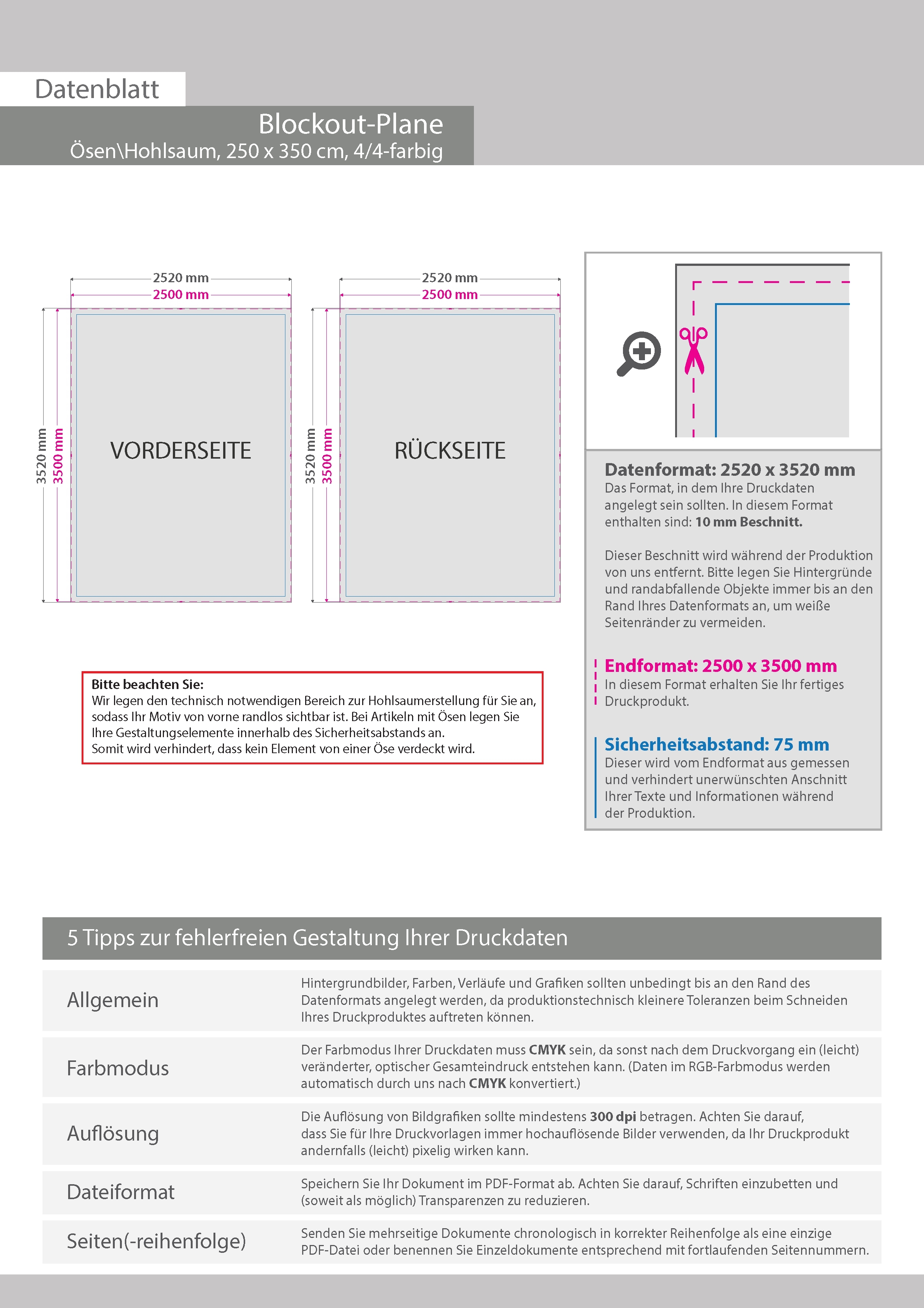 Hochwertige Blockout-Plane 250 x 350 cm, 4/4-farbig bedruckt, Ösen im Abstand von 50 cm links und rechts