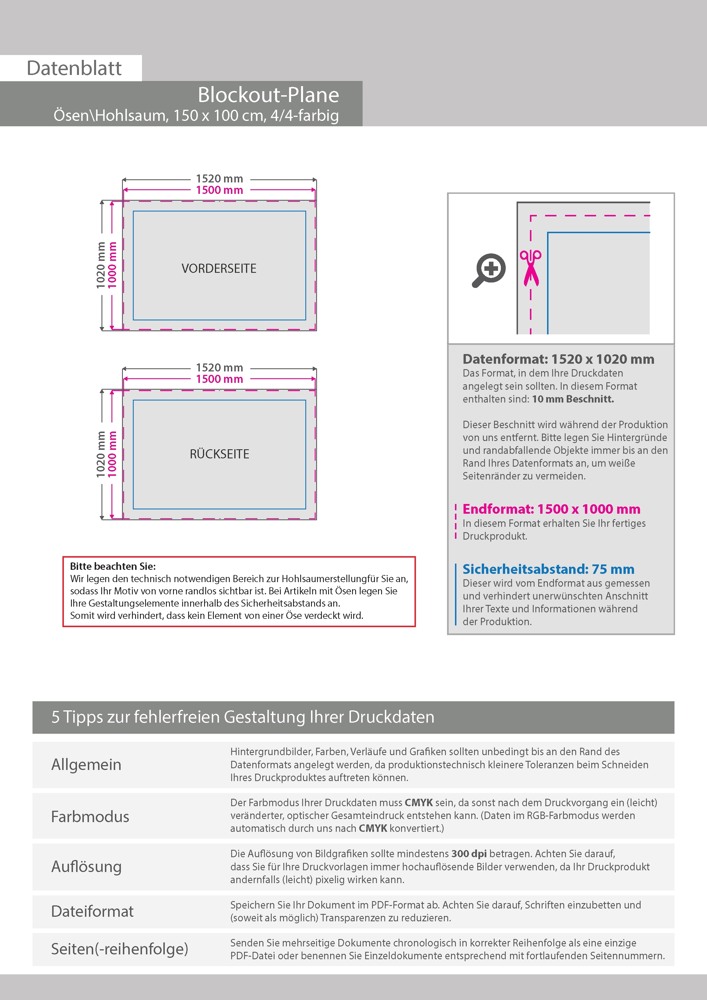 Hochwertige Blockout-Plane 150 x 100 cm, 4/4-farbig bedruckt, Ösen im Abstand von 50 cm rundum