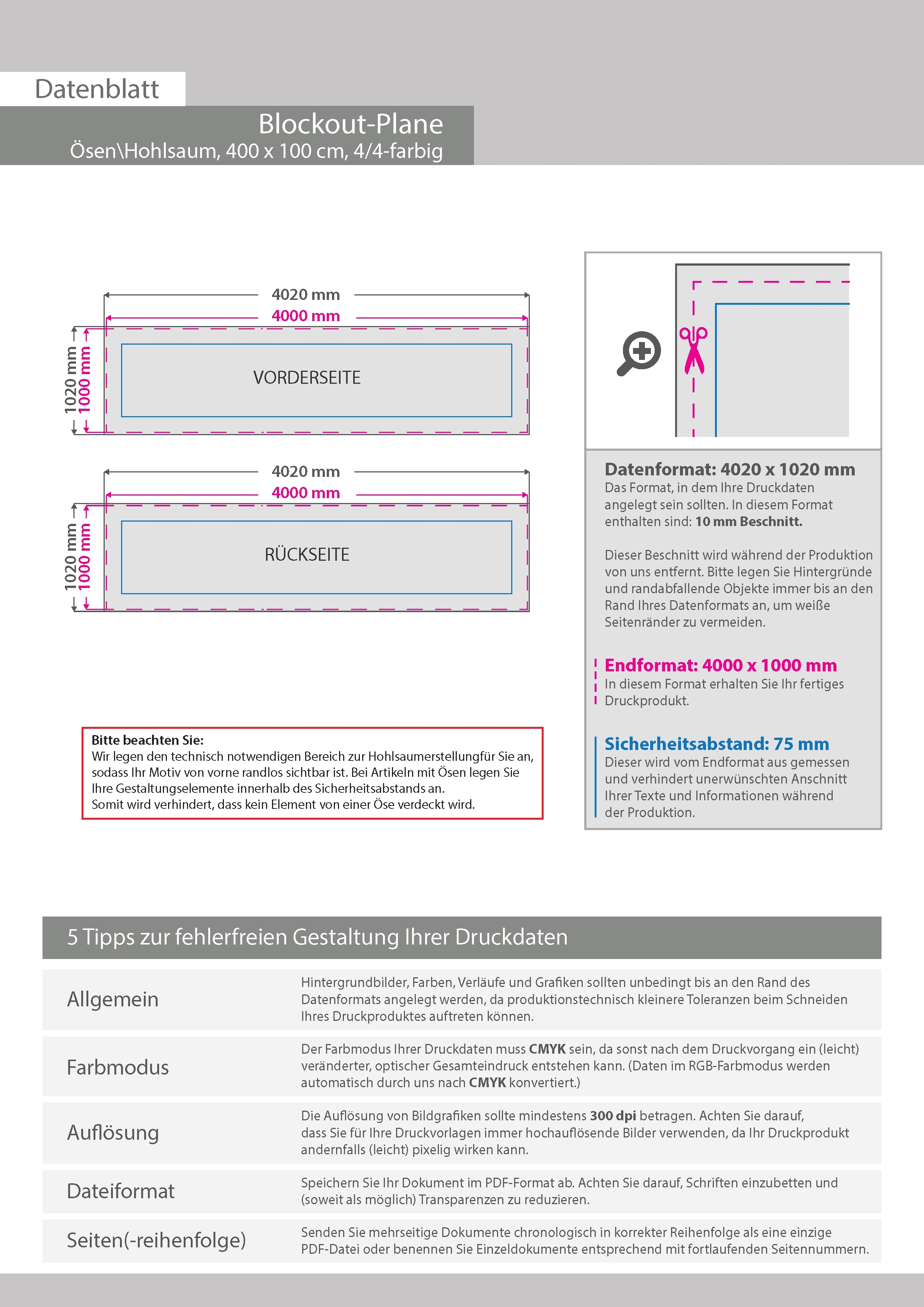 Hochwertige Blockout-Plane 400 x 100 cm, 4/4-farbig bedruckt, Ösen im Abstand von 50 cm rundum