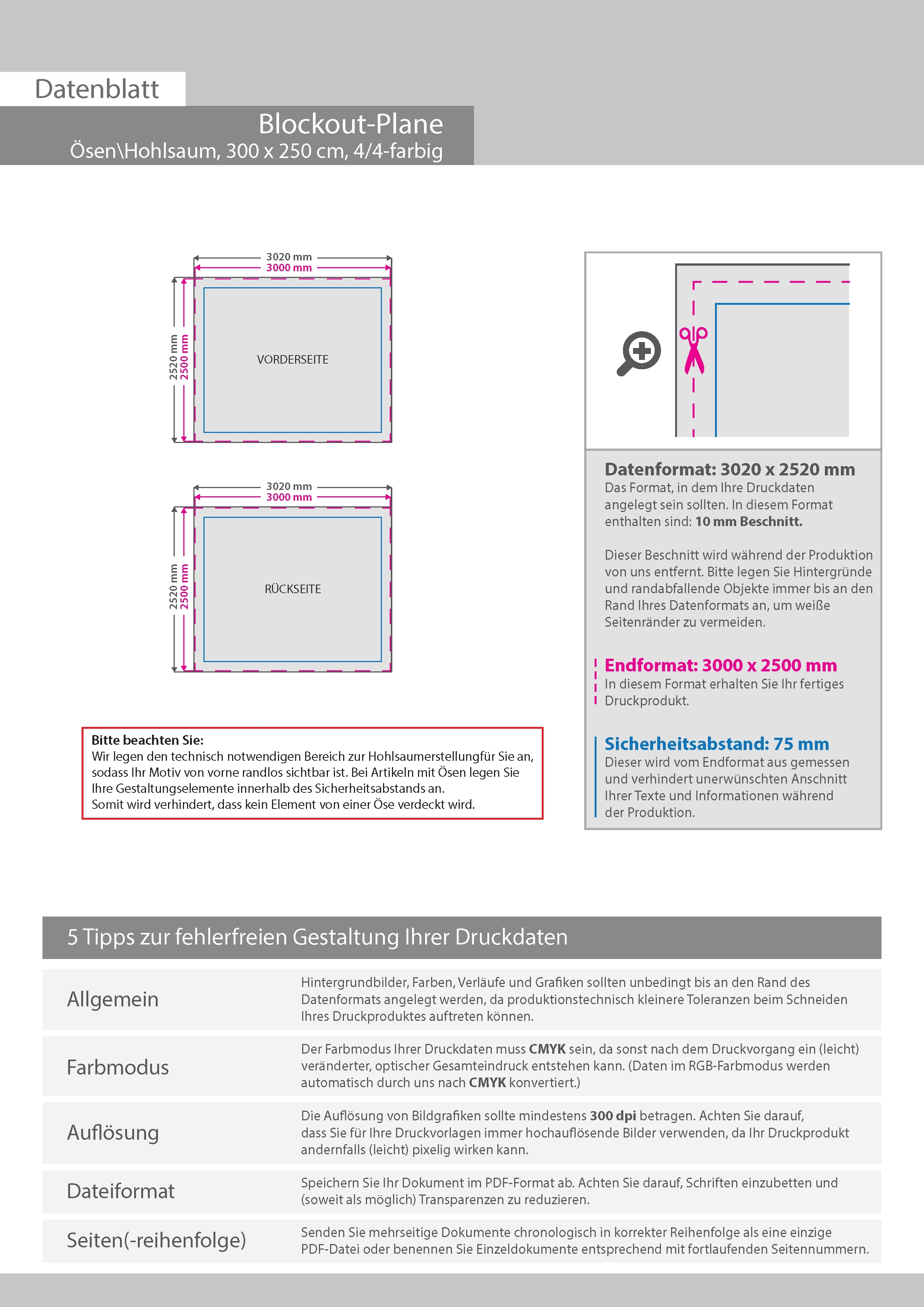 Hochwertige Blockout-Plane 300 x 250 cm, 4/4-farbig bedruckt, Hohlsaum oben und unten (Durchmesser Hohlsaum 6,0 cm)